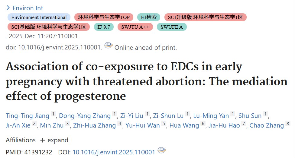 2025年12月11日,在《Environment International》上发表一篇名为“Association of co-exposure to EDCs in early pregnancy with threatened abortion: The mediation effect of progesterone”的研究论文,本研究旨在探讨内分泌干扰化学物质(EDCs)共暴露模式与先兆流产(TA)之间的关联,并评估孕酮(P4)的潜在介导效应。