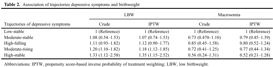 结果:GBTM识别出五条抑郁症状轨迹。在IPTW调整后的纵向分析中,与低稳定抑郁症状轨迹相比,只有高稳定轨迹 (OR = 1.35, 95% CI: 1.15 - 2.52) 和中度上升轨迹 (OR = 1.18, 95% CI: 1.12 - 1.85) 增加低出生体重(LBW)的风险。中稳定和高下降轨迹的LBW风险未见显著增加。然而,抑郁症状轨迹与巨大儿风险无显著关联。