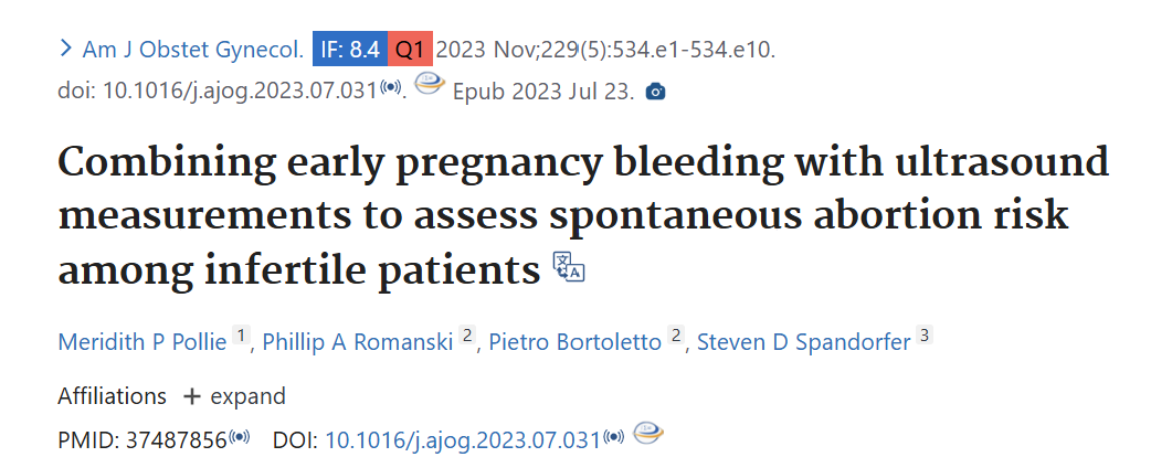 2023年11月,《American Journal of Obstetrics & Gynecology》发表重磅研究,首次明确早孕期阴道出血联合孕6-7周超声测量指标,可精准分层不孕患者胚胎移植后的自然流产风险,为临床咨询和风险评估提供关键依据,填补了不孕人群早孕期出血预后评估的研究空白!