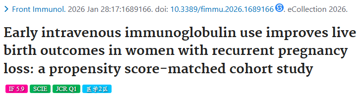 2026年1月,中国学者在《Frontiers in Immunology》(2区,IF=5.9)发表标题为:“Early intravenous immunoglobulin use improves live birth outcomes in women with recurrent pregnancy loss: a propensity score–matched cohort study”的研究论文。