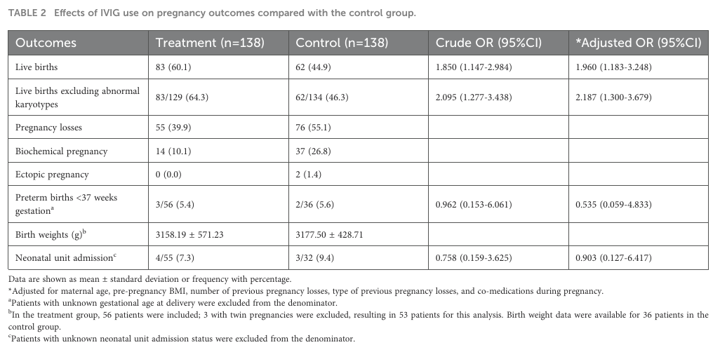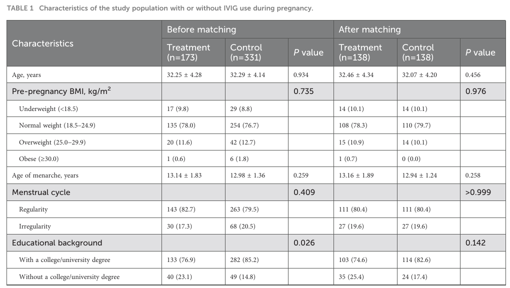 Xin W, Mu F, Wang K, Wang F. Early intravenous immunoglobulin use improves live birth outcomes in women with recurrent pregnancy loss: a propensity score-matched cohort study. Front Immunol. 2026 Jan 28;17:1689166.