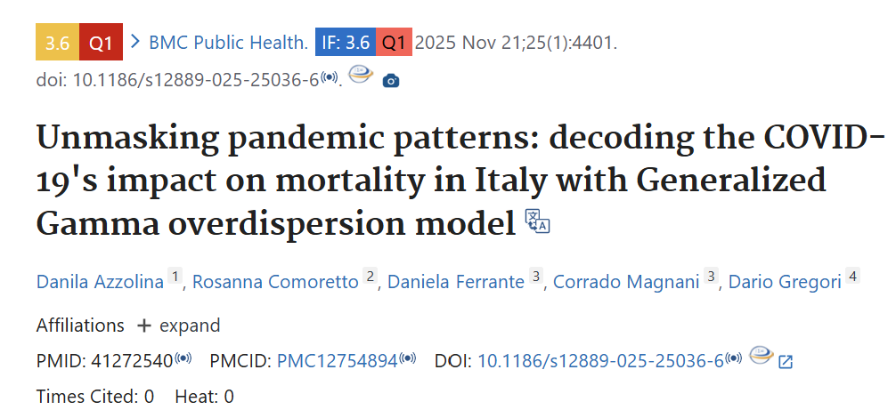 2025年11月,《BMC Public Health》刊发题为Unmasking pandemic patterns: decoding the COVID-19’s impact on mortality in Italy with Generalized Gamma overdispersion model的研究,基于2015-2023年意大利全人口死亡数据,解析新冠疫情对死亡率的长期影响与复杂规律。