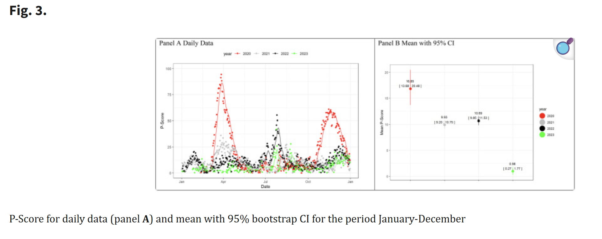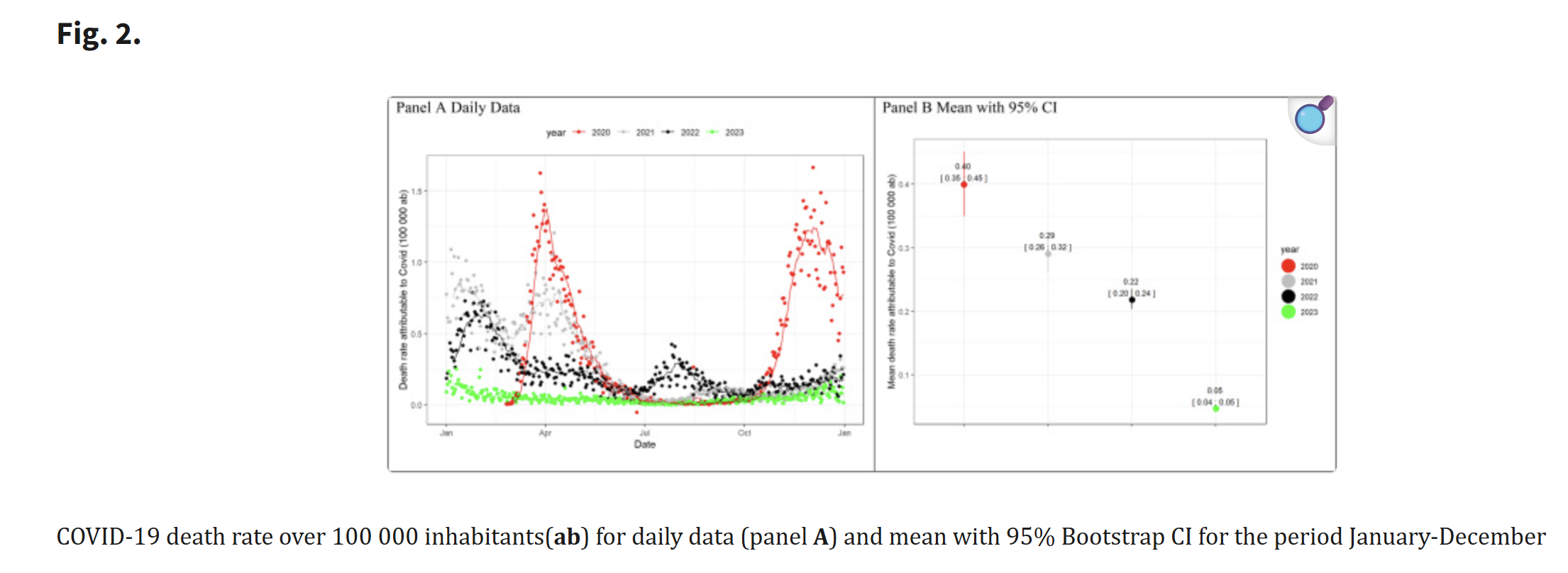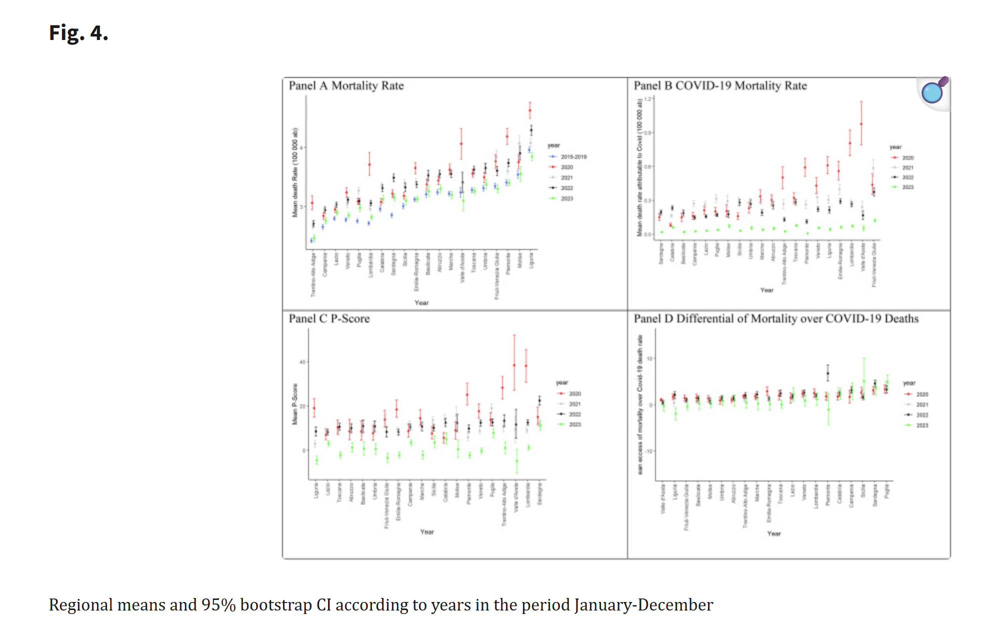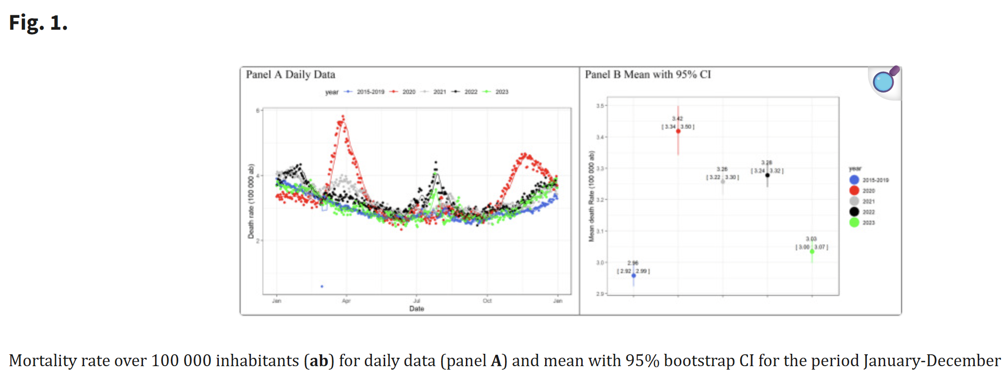 研究数据来自意大利国家统计库(ISTAT)2015年至2023年12月全国7901个市镇按市镇、年龄、性别划分的死亡数据与人口数据,新冠相关死亡数据则来源于意大利民防部门每日区域统计数据,经帕多瓦大学数据仓库处理,研究将人群按年龄分为<65岁和≥65岁两组,按区域划分为意大利北部和中南部两组开展分析。