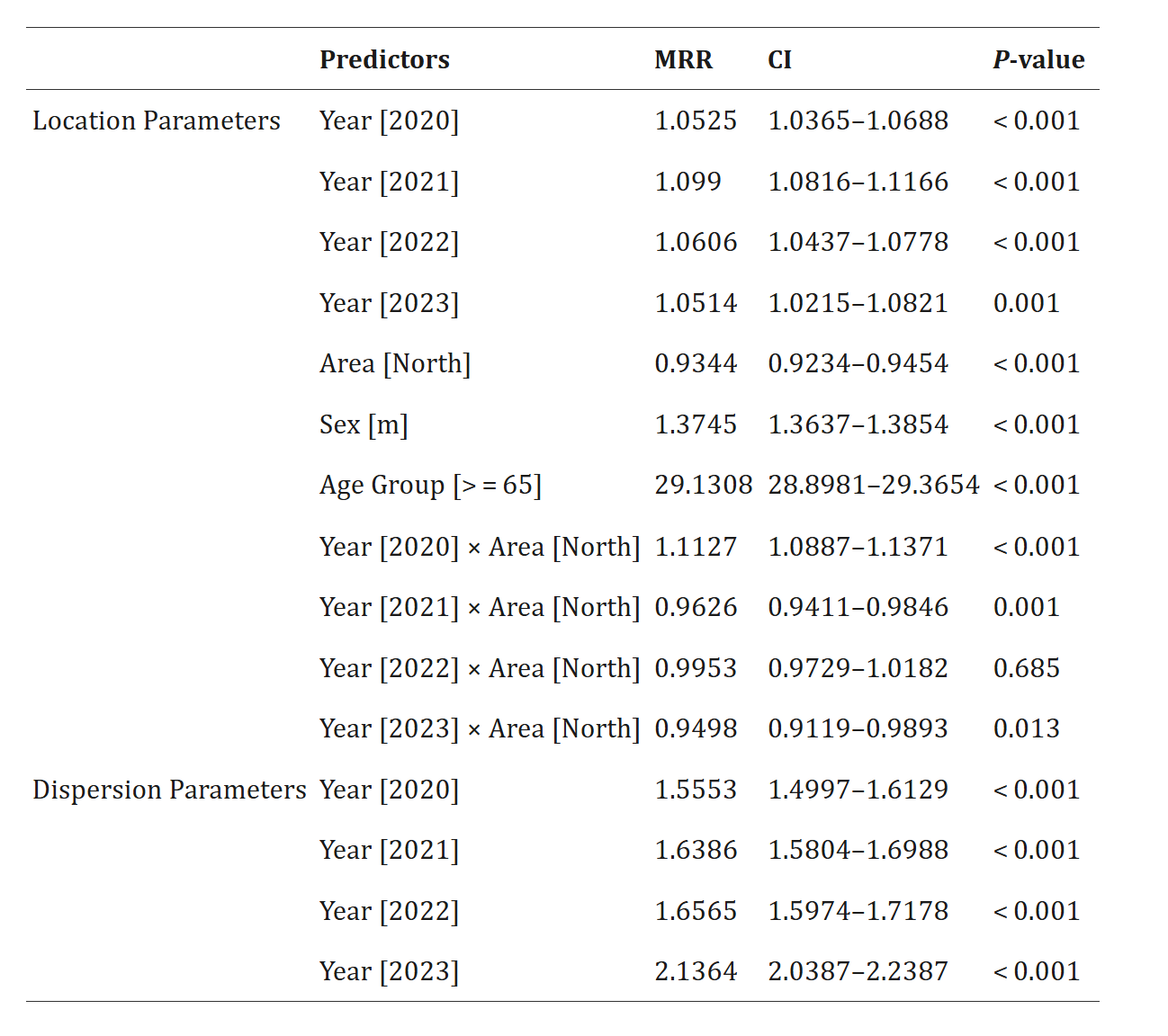 数据建模结果表明,对疫情期间前八个月的死亡数据应用GAMLSS模型分析后发现,2021至2023年意大利全国死亡率均有所上升,2020年疫情早期仅北部地区死亡率较2015-2019年平均水平显著上升,北部地区在2021年和2023年死亡率有所下降,交互效应显示2020年北部地区死亡率显著高于南部地区,模型同时估算出男性和65岁及以上人群具有更高的死亡率比(MRR),过离散参数则表明疫情期间死亡率的波动性显著增加(见表1)。